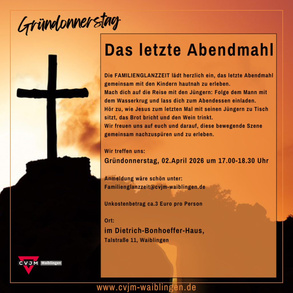 DO 02.04.2026 Gründonnerstag – Abendmahl 17.00 Uhr (um Anmeldung wird gebeten)